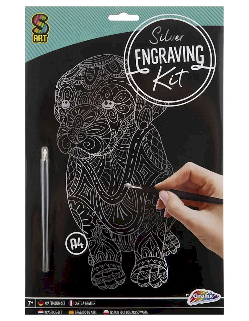 W zestawie znajduje się arkusz A4 z naniesionym wzorem do wydrapywania oraz narzędzie.
