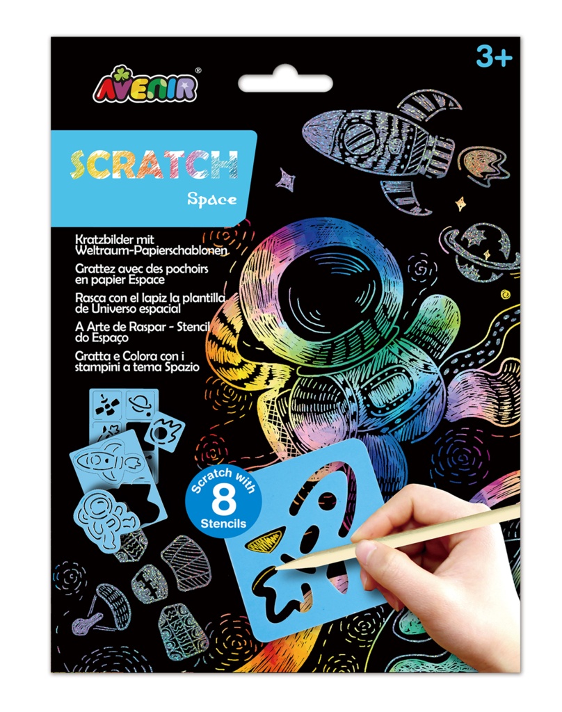 Avenir Scratch to zupełnie nowe podejście do prac ręcznych. Wyjątkowy arkusz, na którym tworzy się poprzez zdrapywanie warstwy wierzchniej, by odsłonić wielobarwną warstwę spodnią. Zdrap 2 magiczne arkusze kosmosu, korzystając z 8 szablonów z motywami kosmosu. Do zestawu dołączony również patyczek do zdrapywania oraz szmatka do wycierania.