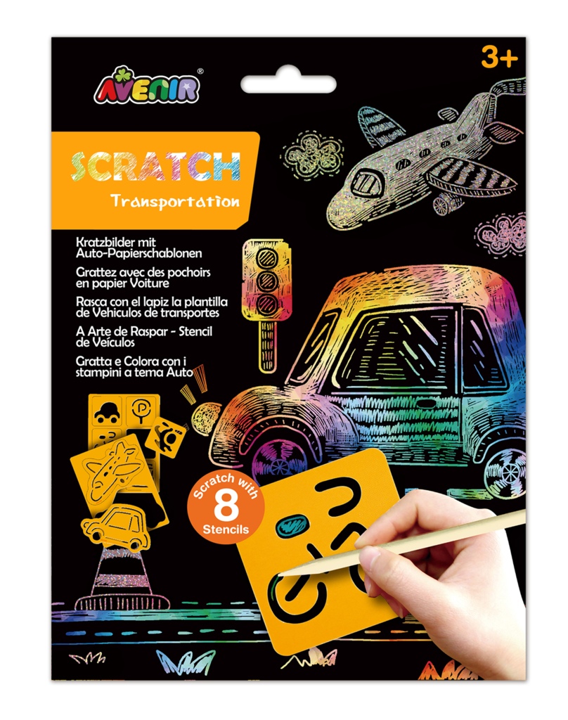 Avenir Scratch to zupełnie nowe podejście do prac ręcznych. Wyjątkowy arkusz, na którym tworzy się poprzez zdrapywanie warstwy wierzchniej, by odsłonić wielobarwną warstwę spodnią. Zdrap 2 magiczne arkusze transportu, korzystając z 8 szablonów z motywami transportu. Do zestawu dołączony również patyczek do zdrapywania oraz szmatka do wycierania.