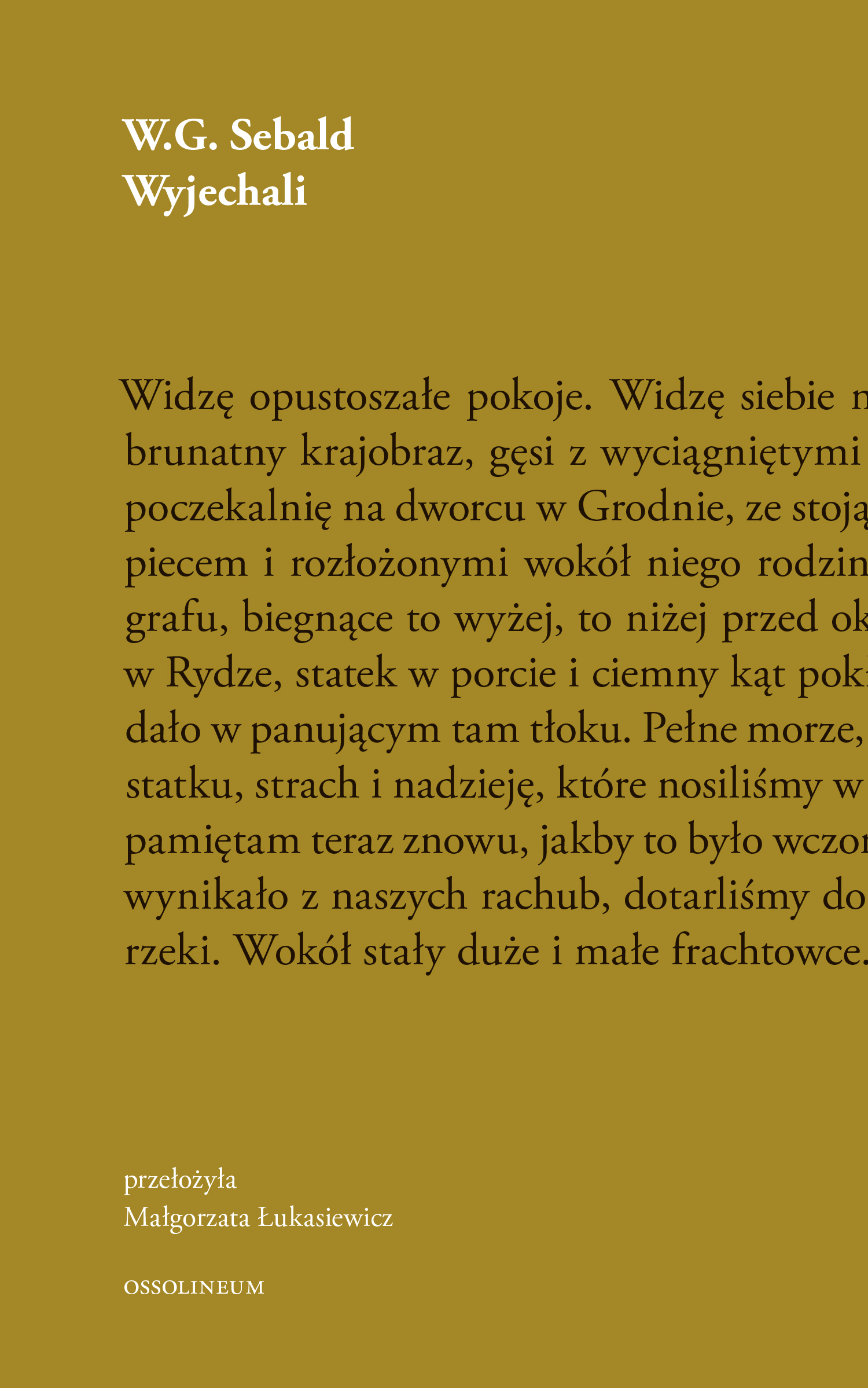 Niezwykła książka urodzonego pod koniec wojny znakomitego niemieckiego pisarza początkowo sprawia wrażenie niemal dokumentalnej relacji z życia czterech żydowskich wygnańców, zamieszkałych w Austrii, Anglii i Stanach Zjednoczonych wrażenie spotęgowane obecnością fotografii, listów i dzienników podróży. Jednak w miarę lektury czytelnik odkrywa, że ma do czynienia z oryginalnym, wielowymiarowym gatunkiem literackim, stworzonym, by jak najwnikliwiej zanurzyć się w przeszłość ludzi, którym Holokaust odebrał ojczyznę i tożsamość. Narrator Sebalda, wrażliwy słuchacz ich opowieści, podąża za nimi z Litwy do Londynu, z Monachium do Manchesteru, z południowych Niemiec do Francji, Nowego Jorku, Konstantynopola i Jerozolimy, zbierając materialne świadectwa istnienia w czasie i przestrzeni. Rozkłady jazdy, bilety do kina, autografy i pocztówki najbardziej przyziemny szczegół emanuje tajemniczym, niebezpiecznym znaczeniem i zarazem ewokuje utracony raj.