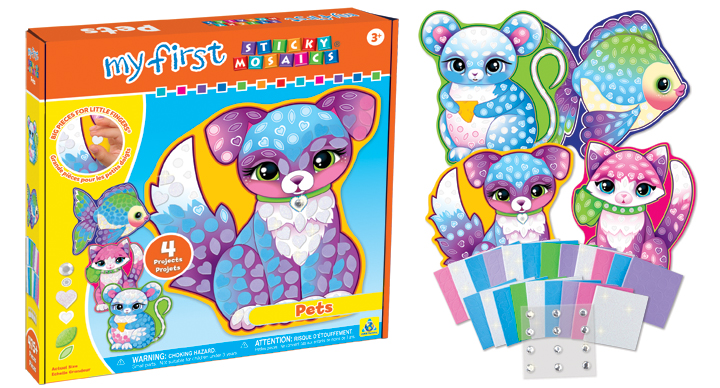 Stwórz obrazki z czterema wesołymi zwierzakami dopasowując kształty i kolory. Elementy zestawu są naprawdę duże, tak aby nie sprawiały problemów nawet najmłodszym, przedszkolnym artystom. Po stworzeniu dzieła możesz użyć plastikowych zawieszek,aby obrazek powiesić na ścianie.Naklejki nakleja się na odpowiadające im kolorowe figury geometryczne .