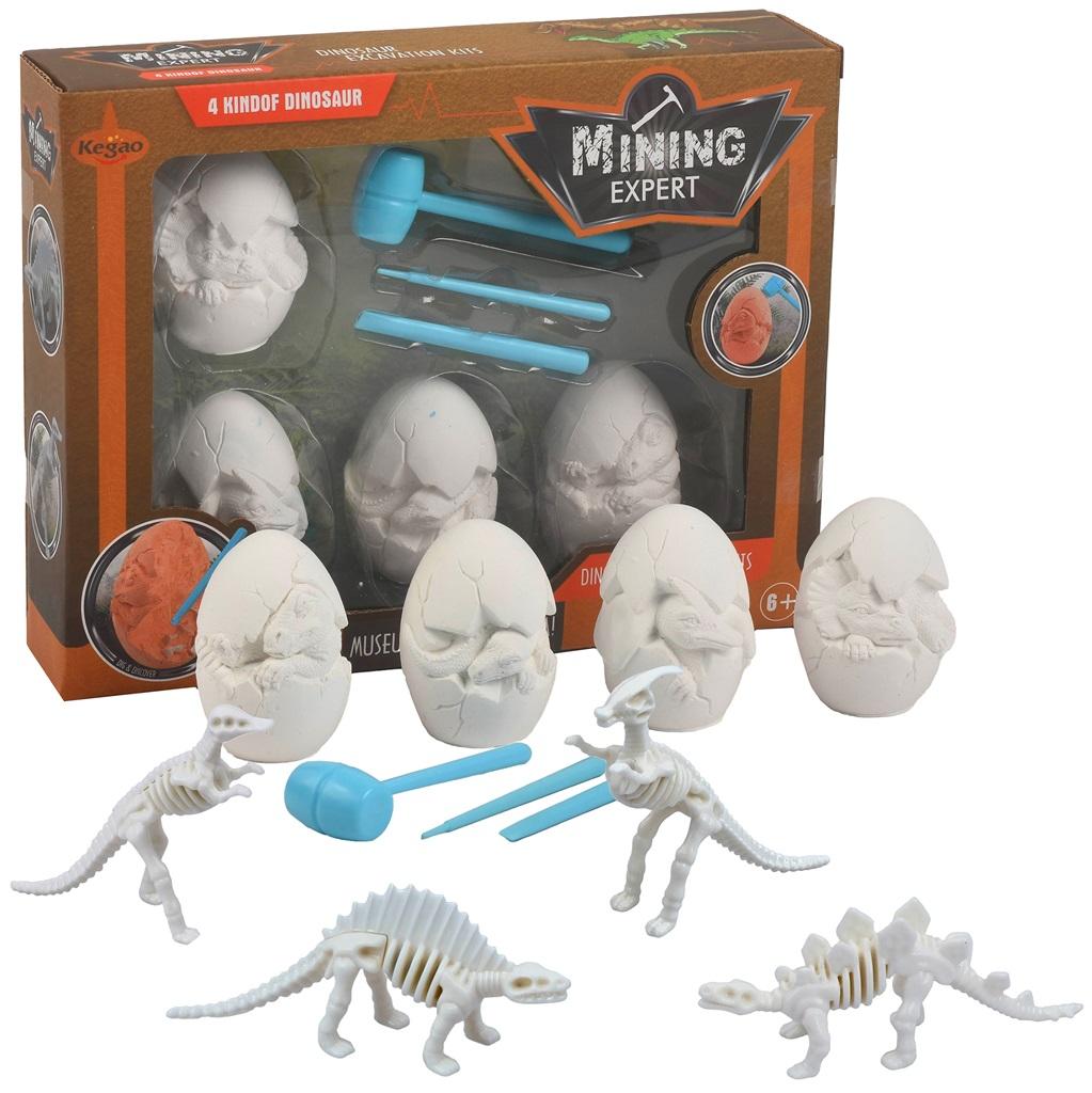 Zestaw zawiera 5 gipsowych jajek z których za pomocą narzędzi należy wydobyć dinozaura, świetny zestaw, który pozwoli dziecku poczuć się jak naukowiec paleontolog.