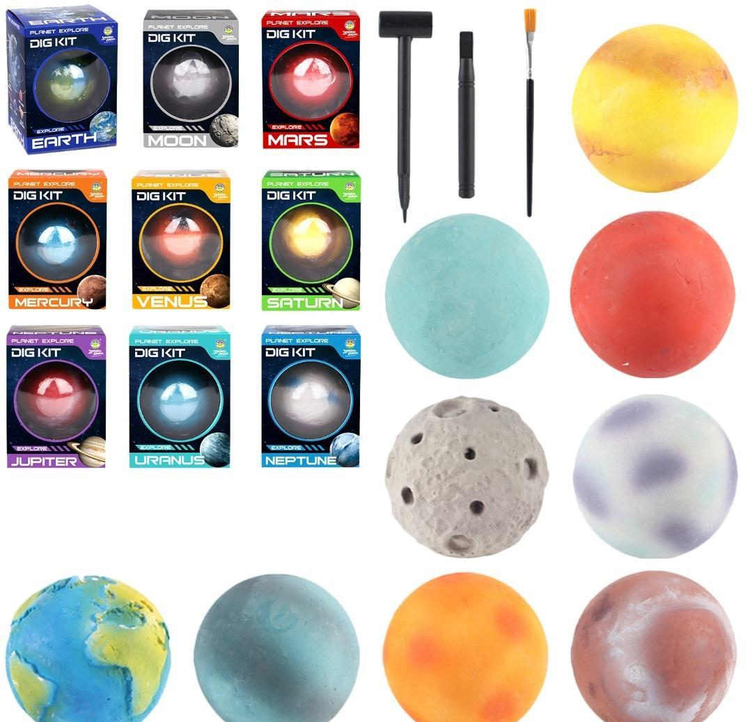 Zestaw do Odkrywania Ukrytej Planety "Planet Explore Dig Kit" - Odkop Swój Własny Układ Słoneczny! Przedstawiamy niezwykły zestaw "Planet Explore Dig Kit", który przeniesie Twoje dziecko w fascynującą podróż kosmiczną i archeologiczną zarazem! Każde opakowanie to mini-blok, w którym ukryta jest jedna z planet lub księżyc Układu Słonecznego. To idealna zabawka dla małych astronomów i odkrywców, która zapewni wiele godzin kreatywnej zabawy i edukacji. Główne cechy produktu: Zestaw do odkopywania planet: Każdy zestaw zawiera blok gipsowy (lub podobnej masy), w którym zatopiona jest figurka planety lub księżyca. Proces odkopywania jest niczym prawdziwe wykopaliska! Kompletny Układ Słoneczny: Dostępne są zestawy z różnymi ciałami niebieskimi, takimi jak Ziemia, Księżyc, Mars, Merkury, Wenus, Saturn, Jowisz, Uran i Neptun. Pozwala to na zebranie całej kolekcji i zbudowanie własnego modelu Układu Słonecznego. Narzędzia do wykopalisk: Do każdego zestawu dołączone są plastikowe narzędzia - młotek i dłuto/skrobak oraz pędzelek. Ułatwiają one precyzyjne wydobycie planety z bloku. Realistyczne figurki planet: Odkopane figurki planet są pomalowane w sposób imitujący ich rzeczywiste kolory i powierzchnie, co sprawia, że są nie tylko zabawką, ale także modelem edukacyjnym. Rozwija cierpliwość i precyzję: Proces odkopywania wymaga skupienia, cierpliwości i precyzyjnych ruchów, co doskonali zdolności manualne i koordynację ręka-oko. Wspiera edukację STEM: Zestaw w ciekawy sposób wprowadza dzieci w zagadnienia astronomii i geologii, pobudzając ich ciekawość naukową i chęć poznawania świata. Idealny na prezent: Zestaw jest estetycznie zapakowany w kartonowe pudełko z grafiką przedstawiającą daną planetę, co sprawia, że jest gotowym i atrakcyjnym prezentem dla każdego małego odkrywcy. Zalecany wiek: 6+ (zgodnie z oznaczeniem na opakowaniu). Wielkość opakowania: 13x10x10 cm Daj swojemu dziecku szansę na ekscytujące odkrycie i posiadanie własnej kolekcji planet Układu Słonecznego z zestawem "Planet Explore Dig Kit"!