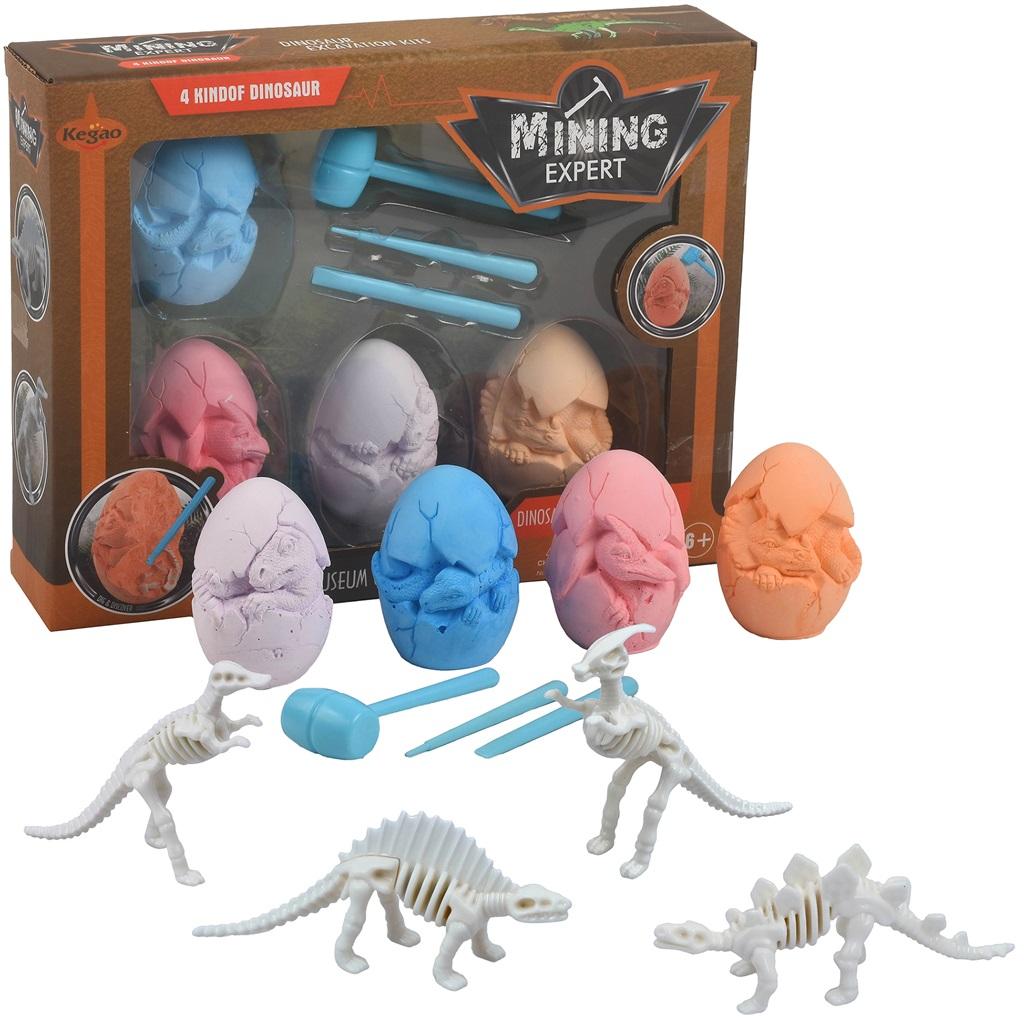 Zestaw zawiera 4 kolorowe gipsowe jajka, z których za pomocą narzędzi należy wydobyć dinozaura, świetny zestaw, który pozwoli dziecku poczuć się jak naukowiec paleontolog.
