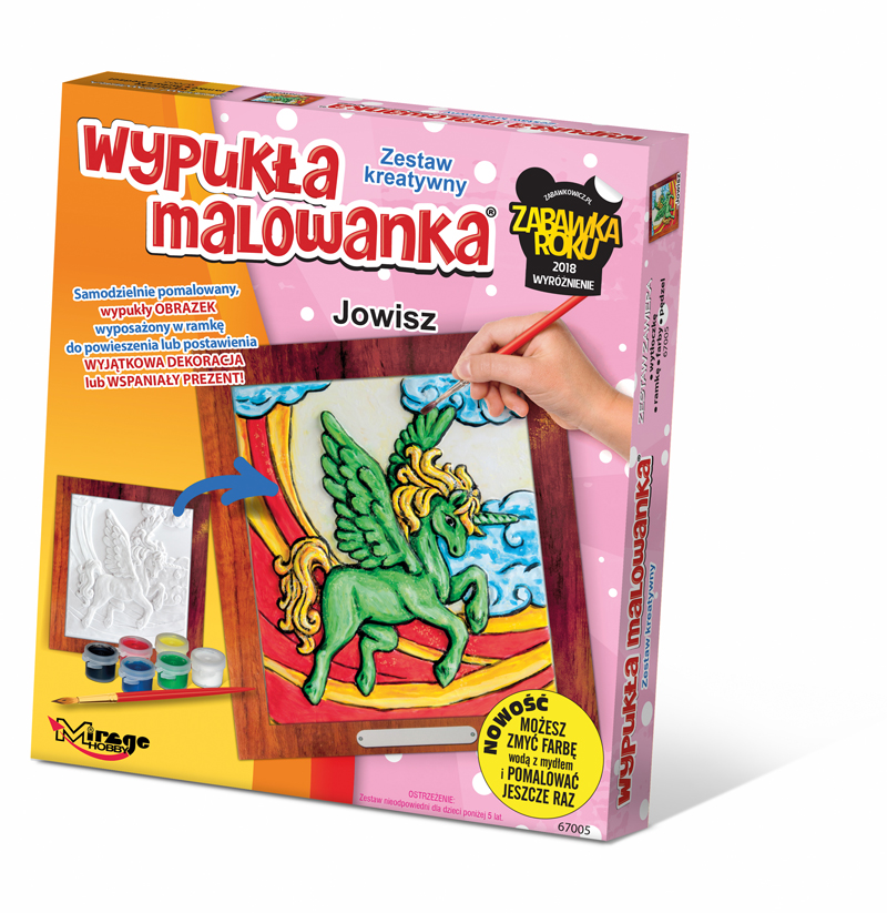 Obrazek pupila w Zestawach Kreatywnych Mirage Hobby, to wypukła wytłoczka 3D. Ponieważ jest ona wykonana z plastiku, możliwe jest umycie obrazka ciepłą wodą z mydłem i powtórne jego pomalowanie. Dzięki temu można poprawiać i dopracowywać swoje dzieło do uzyskania pożądanego efektu.