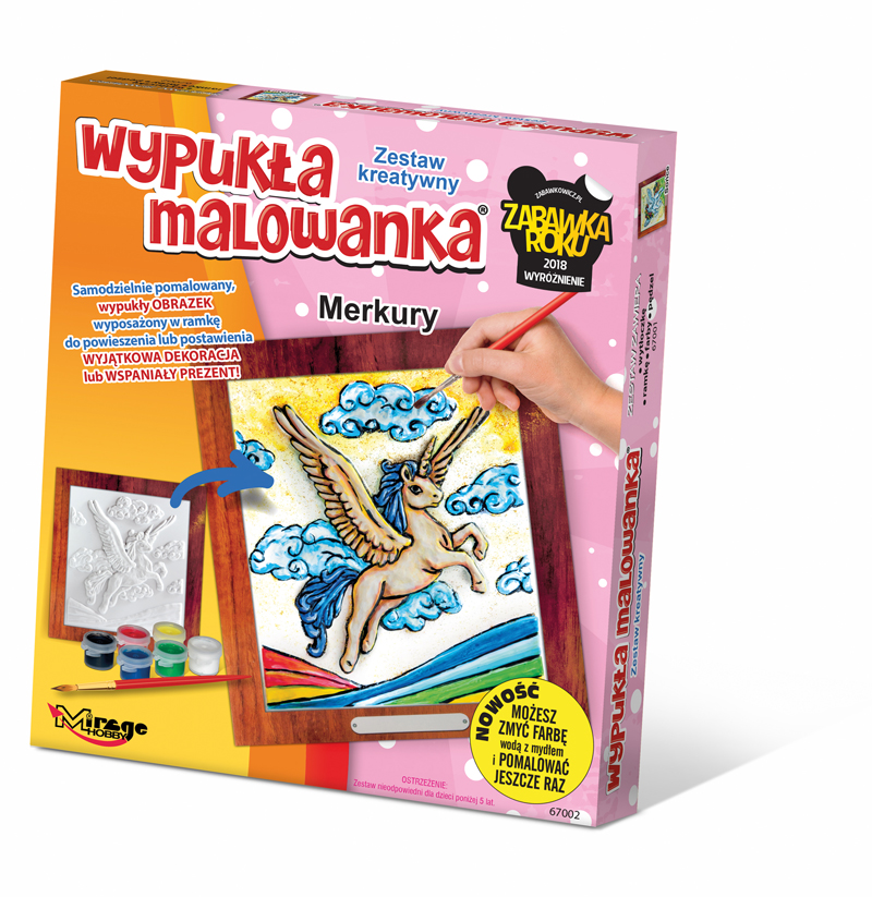 Obrazek pupila w Zestawach Kreatywnych Mirage Hobby, to wypukła wytłoczka 3D. Ponieważ jest ona wykonana z plastiku, możliwe jest umycie obrazka ciepłą wodą z mydłem i powtórne jego pomalowanie. Dzięki temu można poprawiać i dopracowywać swoje dzieło do uzyskania pożądanego efektu.