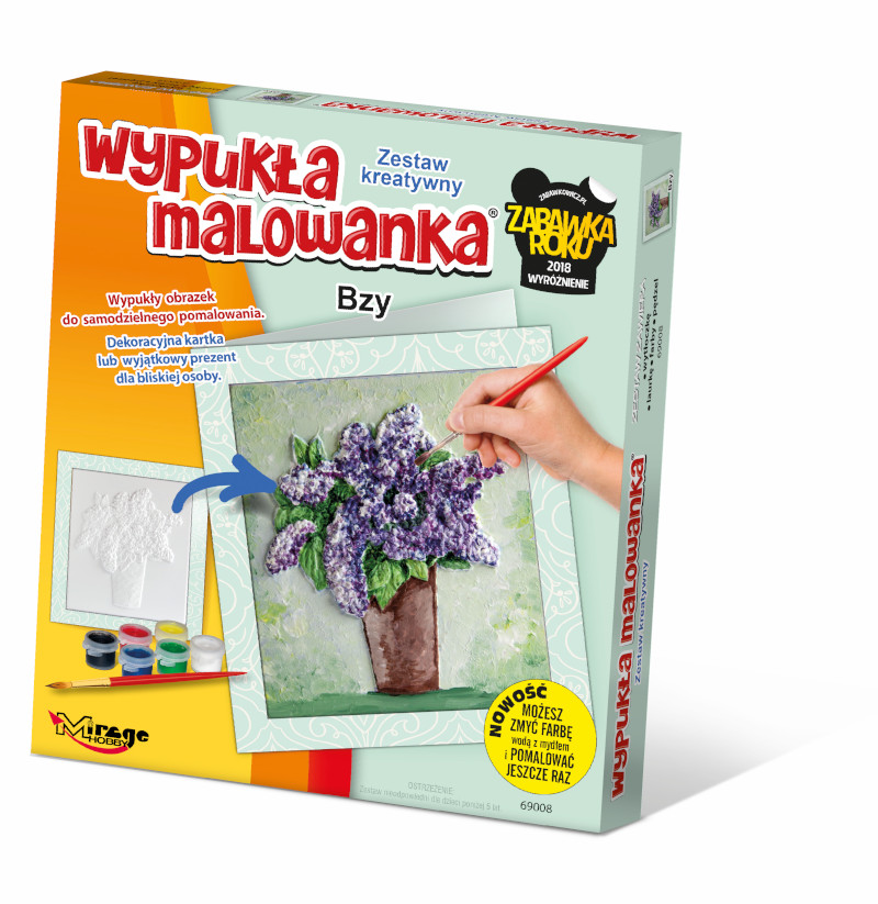 Wypukła Malowanka od Mirage Hobby to Zestaw Kreatywny dla osób powyżej 5. roku życia. Zestaw zawiera wypukły i kształtny obrazek, farbki akrylowe, pędzelek oraz ramkę z kartonu do postawienia lub powieszenia. Malowanka jest w całości plastikowa. Dzięki temu można ją powtórnie pomalować, zmywając zaraz po pomalowaniu ciepłą wodą z mydłem. Obrazek ma odpowiedni do wzoru wypukły kształt, który jest dobrze odczuwalny w dotyku. Produkt jest wymyślony i wyprodukowany w Polsce! Wszelkie prawa zastrzeżone. Każda Wypukła Malowanka to konkretny wzór z danej serii. Kolekcja jest podzielona na różne serie np. Koty, Psy, Konie, Futrzaki, Dinozaury, Jednorożce czy Kwiaty. Seria Wypukła Malowanka Zestaw Kreatywny została nagrodzona Wyróżnieniem Zabawka Roku 2018.