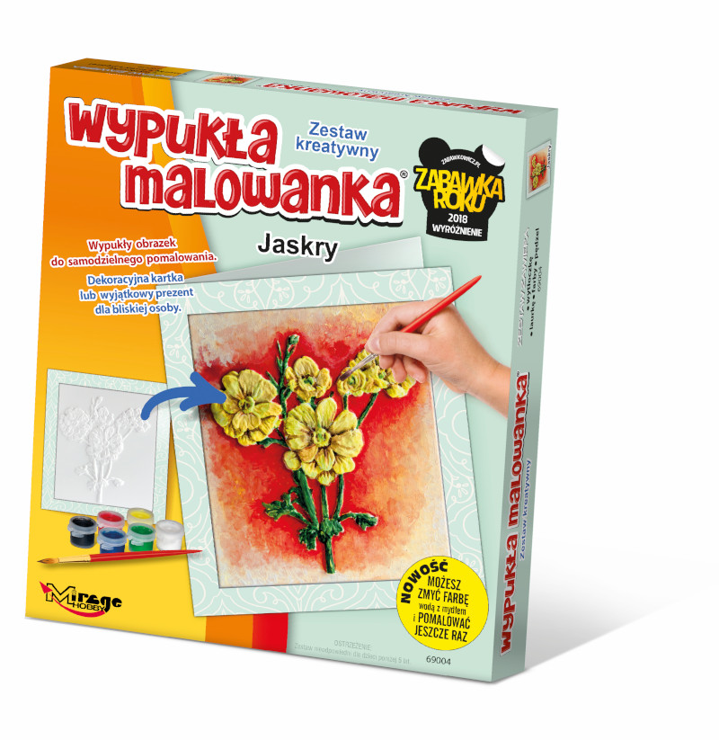 Wypukła Malowanka od Mirage Hobby to Zestaw Kreatywny dla osób powyżej 5. roku życia. Zestaw zawiera wypukły i kształtny obrazek, farbki akrylowe, pędzelek oraz ramkę z kartonu do postawienia lub powieszenia. Malowanka jest w całości plastikowa. Dzięki temu można ją powtórnie pomalować, zmywając zaraz po pomalowaniu ciepłą wodą z mydłem. Obrazek ma odpowiedni do wzoru wypukły kształt, który jest dobrze odczuwalny w dotyku. Produkt jest wymyślony i wyprodukowany w Polsce! Wszelkie prawa zastrzeżone. Każda Wypukła Malowanka to konkretny wzór z danej serii. Kolekcja jest podzielona na różne serie np. Koty, Psy, Konie, Futrzaki, Dinozaury, Jednorożce czy Kwiaty. Seria Wypukła Malowanka Zestaw Kreatywny została nagrodzona Wyróżnieniem Zabawka Roku 2018.