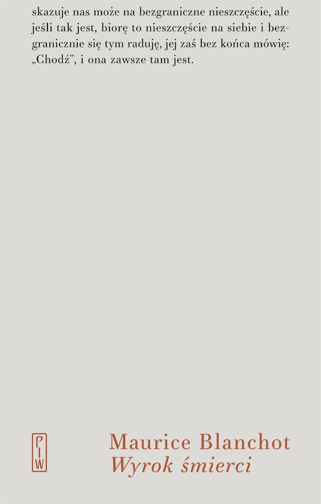 ?Pisanie jest po trosze umieraniem? ? hołdując tej zasadzie, Maurice Blanchot, jeden z wielkich samotników dwudziestowiecznej literatury, poświęcił się pisaniu. Wyrok śmierci, najsłynniejsza z jego krótkich powieści, ma pozory autobiografii, ale kiedy Blanchot pisze: ?Te wypadki przydarzyły się w 1938 roku?, nie ma rzeczy mniej pewnej niż to, kiedy i czy owe wydarzenia się rozegrały. To proza medytacyjna, skupiona na umieraniu bliskiej osoby, być może naznaczona własną chorobą autora, jego osobistym wyrokiem śmierci. Z niebywałą mocą przybliża się do śmierci i ją odsłania, jak nigdy nie uczynił żaden utwór.