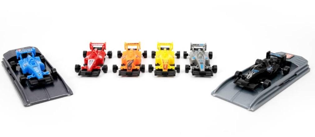 - W zestawie znajdują się 6x różnokolorowych samochodzików - 2x wyrzutnie - Samochodzik należy umieścić na wyrzutni - Przesunąć go do końca - Nacisnąć w miejsce z napisem "PRESS"