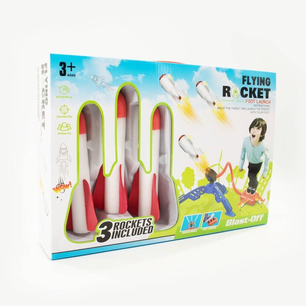 Zestaw posiada 3 miękkie rakiety, 3 nóżki do złożenia wyrzutni, pompkę nożną do wystrzeliwania rakiet. Wyrzutnie z możliwością obrotu o 360 stopni. Produkt nie wymaga użycia baterii.
