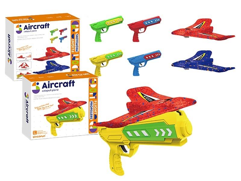 4 wzory; w zestawie: pistolet wym. 22 x 13 cm; samolot dł.: 16,5 cm; funkcje: po naciśnięciu spustu pistolet uwalnia zgromadzoną energię i wypycha samolot do przodu; wym. opak.: 86,5 x 76 x 39,5 cm; 3+