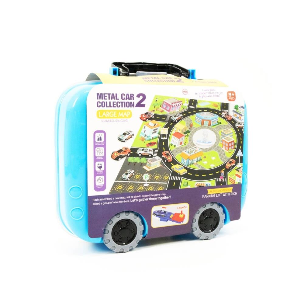 Zestaw autek 9 sztuk w plastikowej kasetce + wyrzutnia + mata imitująca ulicę o wymiarach 80 x 70 cm.