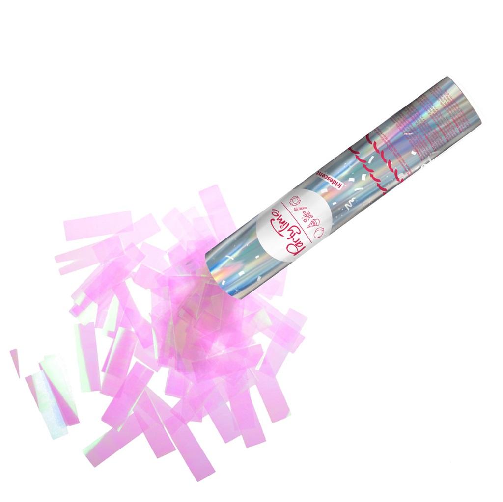 Wyrzutnia z foliowym konfetti, pięknie mieniącym się w zależności od kąta padania światła. Długość tuby: 20 cm. Przekręcenie denka zawierającego sprężynę uwalnia wyrzut konfetti na odległość 2 - 4 m.