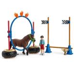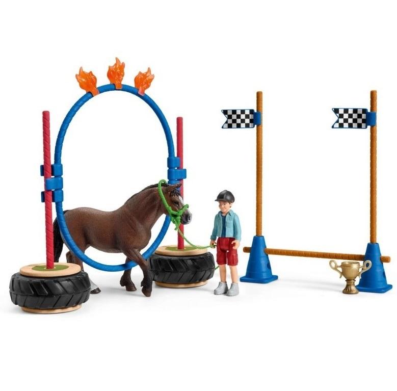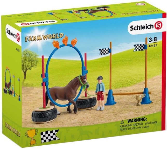 Zestaw wyścig zręcznościowy dla kucyków 42482. Rozpoczynamy kolejny etap tresury kucyków. Jeśli skończyły szkolenie, mogą teraz wziąć udział w wyścigu. Właśnie czekają na start przejęte i pełne niepewności. Czy sprostają zadaniom? Jak będzie przebiegał konkurs? Czy poddadzą się czy też pewnie pokonają przeszkody? Zwinność jest tu tak samo ważna jak jazda. Przeszkody można łączyć i projektować według własnego uznania. Zestaw odpowiedni dla małych i dużych koni Schleich. Figurka chłopca posiada ruchome nogi. Jedna z podstaw słupka może posłużyć za podium dla zwycięzcy.