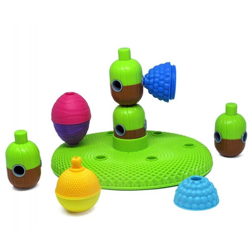 Wyspa Kreatywności to zabawka, która niesamowicie silnie oddziałuje na wyobraźnię! Na zielonej platformie zamontowano słupek złożony z trzech elementów wyposażonych w otwory do wkręcania kulko-klocków. Te możemy także umieszczać na platformie. W zestawie znajdziemy aż 12 elementów do składania i mieszania klocków. Wyspa Kreatywności dostarcza maluchowi wiele zróżnicowanych wrażeń dotykowych klocki mają różną fakturę, która wpływa na receptory czuciowe w rączkach dziecka. Słupek do wkręcania klocków jest ruchomy, co daje umożliwia maluchowi ćwiczenie ruchów obrotowych nadgarstka. Wkręcanie klocków ćwiczy tzw. chwyt pęsetkowy (kciuk i palec wskazujący), a ich łączenie rozwija tzw. małą motorykę dłoni oraz koordynację wzorkowo-ruchową. Klocki można również nawlekać, korzystając z dołączonego sznureczka.