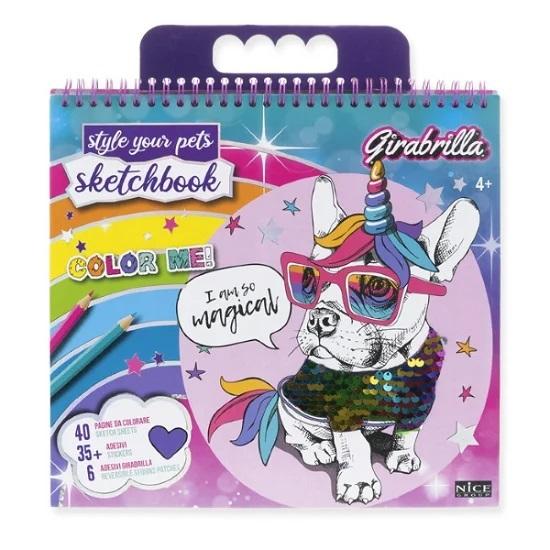 Upiększ swoich zwierzęcych przyjaciół! Pokoloruj i uzupełnij wygląd akcesoriami samoprzylepnymi. Strony mają wiele wstępnie wydrukowanych motywów, ubrań i akcesoriów do pokolorowania i wycięcia. Produkt zawiera: modele sukienek Girabrilla w odwracalne cekiny, 40 stron, naklejki oraz 6 sukienek. Wiek: 4+