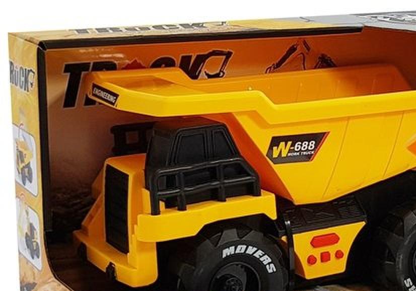 Wywrotka z Napędem Frykcyjnym Dźwięki i Światła Przedstawiamy dużą, plastikową wywrotkę do zabawy w budowlańca. Może uzupełni kolekcję sprzętów budowlanych twojego malucha. Wykonana jest z najwyższej jakości plastiku, co gwarantuje trwałość i bezpieczeństwo podczas użytkowania. Kolorystka żółto- czarna sprawia że pojazd przypomina realistyczny. Autko porusza się za pomocą napędu frykcyjnego wystarczy pociągnąć wózek do tyłu i cieszyć prędkością. Na dole wywrotki mamy 4 przyciski, dzięki którym wywrotka wydaje dźwięki klaksonu, podnoszenia wywrotki, cofania i inne. Dodatkowo posiada efekty świetlne, światła z przodu auta świecą. Zabawa w plac budowy będzie jeszcze bardziej atrakcyjniejsza! Możemy przewozić w niej piasek kamienie czy inne materiały w różne miejsca. Wymiary wywrotki: 25 cm x 13 cm x 14 cm Wymiary opakowania: 30 cm x 15,5 cm x 18 cm Zabawka przeznaczona jest dla dzieci powyżej 3. roku życia. Samochód posiada certyfikat CE i jest zgodny z normą EN 71. Posiada 3 sztuki baterii AG13.