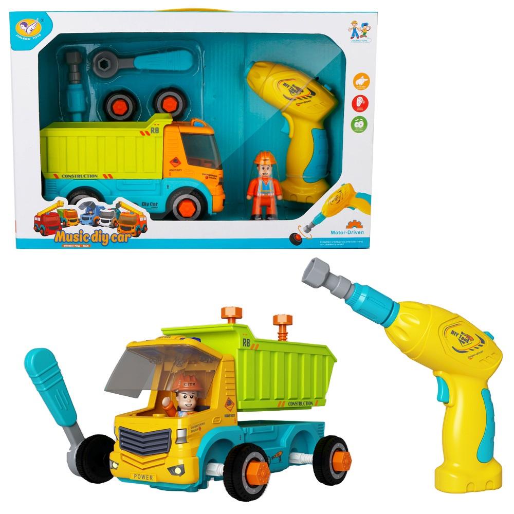 Wywrotka do skręcania z wiertarką. W zestawie również klucz do montowania kół oraz kierowca. Przednia szyba auta podnoszona, dzięki czemu można wyjąć kierowcę. Samochód z dźwiękami, wymaga baterii - 2xAAA (niedołączone). Wiertarka wymaga baterii - 2xAA (niedołączone).