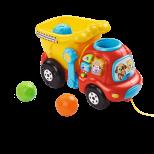 Licz i baw się z Wywrotką Małego Budowniczego. Wrzuć kolorową kulkę do specjalnego otworu na wywrotce, aby usłyszeć nazwy cyfr oraz naciśnij duże kolorowe przyciski, aby poznać kolory i nazwy narzędzi. Rozładuj wywrotkę i rozpocznij zabawę od nowa!