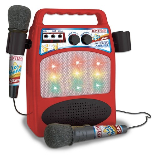 Bezprzewodowy wzmacniacz z 2 mikrofonami z efektem echo. Istnieje możliwość regulacji dźwięku oraz połączenia za pomocą Bluetooth lub kabla do odtwarzacza MP3. Efekty świetlne. Zabawka zasilana 6 bateriami AA, które nie są dołączone do zestawu.