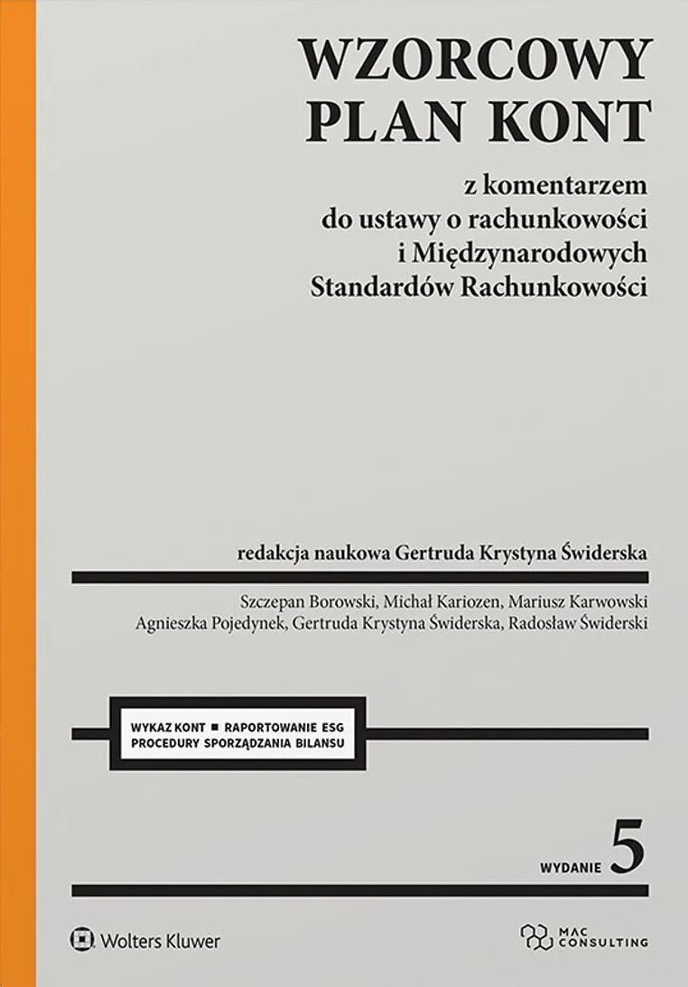 Opracowanie zawiera wykaz kont dla jednostek stosujących ustawę o rachunkowości oraz wykaz kont dla jednostek stosujących Międzynarodowe Standardy Sprawozdawczości Finansowej. W obszernym komentarzu do każdego zespołu kont przedstawiono definicje, podstawowe pojęcia, zasady wyceny wraz z omówieniem różnic między MSSF/MSR a ustawą o rachunkowości. Publikacja zawiera wiele przykładów ilustrujących szczególnie trudne zagadnienia. Główne części publikacji to: wykaz kont syntetycznych w zakresie, który pozwala ująć wszystkie zdarzenia w sposób umożliwiający sporządzenie sprawozdania finansowego w kształcie wymaganym przez ustawę o rachunkowości oraz Międzynarodowe Standardy Sprawozdawczości Finansowej; komentarz do każdego zespołu kont obejmujących część wprowadzającą oraz szczegółowe wyjaśnienia do poszczególnych kont; szczegółowe wyjaśnienia dla każdego konta syntetycznego z typowymi zapisami księgowymi i wskazaniami do rozwinięcia analitycznego zapewniającego spełnienie wymagań związanych ze sporządzaniem bilansu (w tym informacji dodatkowej), klasyfikacji GUS, rozrachunku z budżetem; procedury sporządzania bilansu oraz rachunku zysków i strat na podstawie zawartego w opracowaniu planu kont. W obecnym wydaniu uwzględniono zmiany związane z aktualizacją przepisów ustawy o rachunkowości oraz dyrektyw Parlamentu Europejskiego i Rady dotyczących sprawozdawczości w zakresie zrównoważonego rozwoju (ESG). Uzupełniono konta o znaczniki wynikające z faktu, że podatnicy będą zobowiązani do przesyłania zestawu elektronicznych danych do organów skarbowych w formie jednolitego pliku kontrolnego JPK_ KR_PD. Omówiono również obowiązki sprawozdawcze inne niż sprawozdanie finansowe, czyli sprawozdanie z działalności obejmujące sprawozdawczość zrównoważonego rozwoju, sprawozdanie z płatności na rzecz administracji publicznej i sprawozdanie o podatku dochodowym. Wzorcowy plan kont został przygotowany przez zespół ekspertów łączących doświadczenie praktyczne z dorobkiem naukowym oraz uczestnictwem w pracach legislacyjnych nad prawem finansowym. Publikacja adresowana jest do jednostek prowadzących zarobkową działalność wytwórczą, usługową i handlową, stosujących ustawę o rachunkowości oraz jednostek, które stosują lub zamierzają stosować Międzynarodowe Standardy Rachunkowości, Międzynarodowe Standardy Sprawozdawczości Finansowej oraz związane z nimi interpretacje ogłoszone w formie rozporządzeń Komisji Europejskiej, zwanymi dalej "MSR".