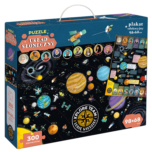 Wiemy, jak zainteresować uczniów i przekazywać nowe wiadomości w pełen humoru sposób. Pokazujemy, że nauka jest fajna, a wiedza daje moc! Ogromna, pełna szczegółów i pięknie zilustrowana układanka przedstawia najsłynniejsze ciała niebieskie, pojazdy kosmiczne, naukowców i odkrywców Układu Słonecznego. Układanie puzzli jest świetną zabawą, która jednocześnie pobudza wyobraźnię i pasję. Edukacyjny zestaw sprawdzi się jako prezent dla ciekawego (wszech)świata ucznia i doskonale sprawdzi się jako puzzle rodzinne.