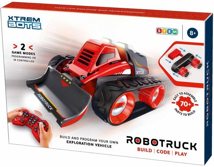 Robotruck posiada 2 silniki elektryczne oraz 2 tryby zabawy - zdalne sterowanie lub programowanie do 50 różnych akcji.
