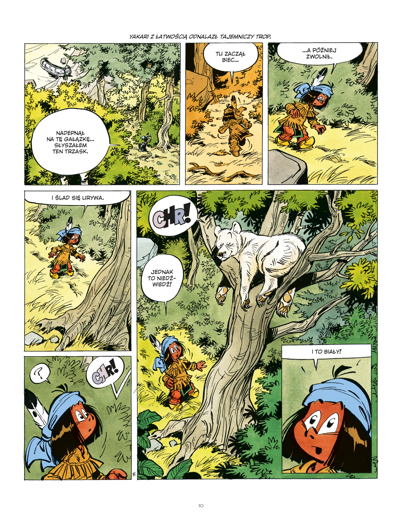 Yakari wie, że białe niedźwiedzie żyją tylko na dalekiej Północy, więc kiedy pewnego wieczoru widzi w lesie to zwierzę, ucieka w przerażeniu, bo jest pewien, że spotkał ducha! Następnego dnia zbiera się na odwagę i wraca do lasu, aby wyjaśnić sprawę. Tak rozpoczyna się kolejna niezwykła przygoda, podczas której chłopiec spróbuje poznać prawdę o białej zjawie, a potem postara się uzyskać pomoc nocnych zwierząt, żeby przechytrzyć szalonego łowcę futer.