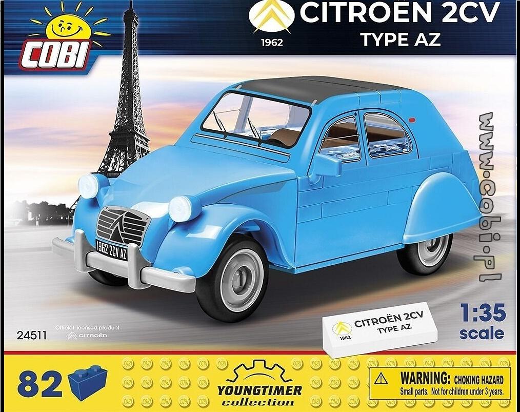 Z 82 klocków konstrukcyjnych COBI wybudujesz rewelacyjnie odwzorowany w modelarskiej skali 1:35, model kultowego Citroena 2CV type AZ. Dzięki zastosowaniu specjalnie zaprojektowanych dla tego auta elementów, kształt karoserii jest maksymalnie zbliżony do oryginału. Na uwagę zasługują również zupełnie nowe lampy przednie, które z pewnością znajdą zastosowanie w wielu modelach Kolekcji Historycznej COBI! Oddzielnym kolorem jest zaznaczony dach wraz z nadrukowanymi klamrami spinającymi. Samochód jest wyposażony w 4 ruchome koła oraz nadruki kluczowych detali. Citroen mierzy 11 cm długości i 4,5 cm wysokości. Do zestawu dołączona jest tabliczka z podpisem modelu i logo CITROEN z epoki! Nadrukowane tablice rejestracyjne również prezentują nazwę modelu.