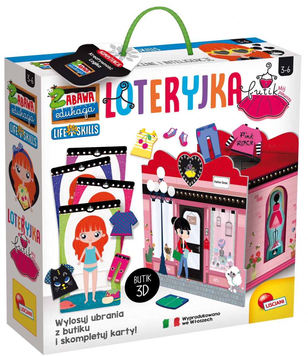 Zestaw edukacyjny zawierający butik z ubraniami, dzięki któremu dziecko ma okazję poznać elementy codziennego ubioru i użyć ich, dopasowując je do odpowiednich postaci. Zabawa i edukacja to nowa seria edukacyjna, która pozwala dzieciom na poznawanie określonych obszarów i zdobywanie istotnych kompetencji, które są istotne w późniejszych etapach życia. Światowa Organizacja Zdrowia wyodrębniła 10 umiejętności życiowych, które są potrzebne by wyrosnąć na lepszą i szczęśliwszą osobę, która jest w stanie prowadzić godne życie. I to właśnie te umiejętności są rozwijane w grach z tej serii, które są również dla dziecka świetną zabawą. Dla dzieci w wieku od 3 do 6 lat