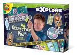Zabawa w detektywa- rozwiąż pięć spraw dotyczących przestępstw Czy potrafisz, jako prawdziwy śledczy kryminalny, rozwiązać te pięć spraw? Kto był w budynku w dniu napadu na bank? Kto zostawił ślady przy ladzie w cukierni? Czyje odciski palców są na obroży skradzionego szczeniaka? A który z podejrzanych ma taką samą grupę krwi jak ta znaleziona na kości dinozaura lub odłamkach szkła w laboratorium nuklearnym? Użyj taśmy, aby zabezpieczyć miejsce zbrodni, zbadaj ślady dowodów za pomocą lupy i innych narzędzi detektywistycznych oraz przeprowadź badania krwi, aby odkryć właściwego winowajcę!.
