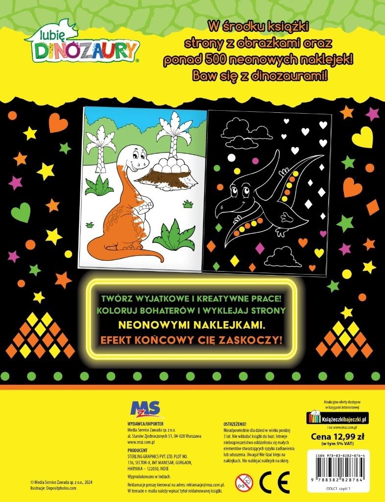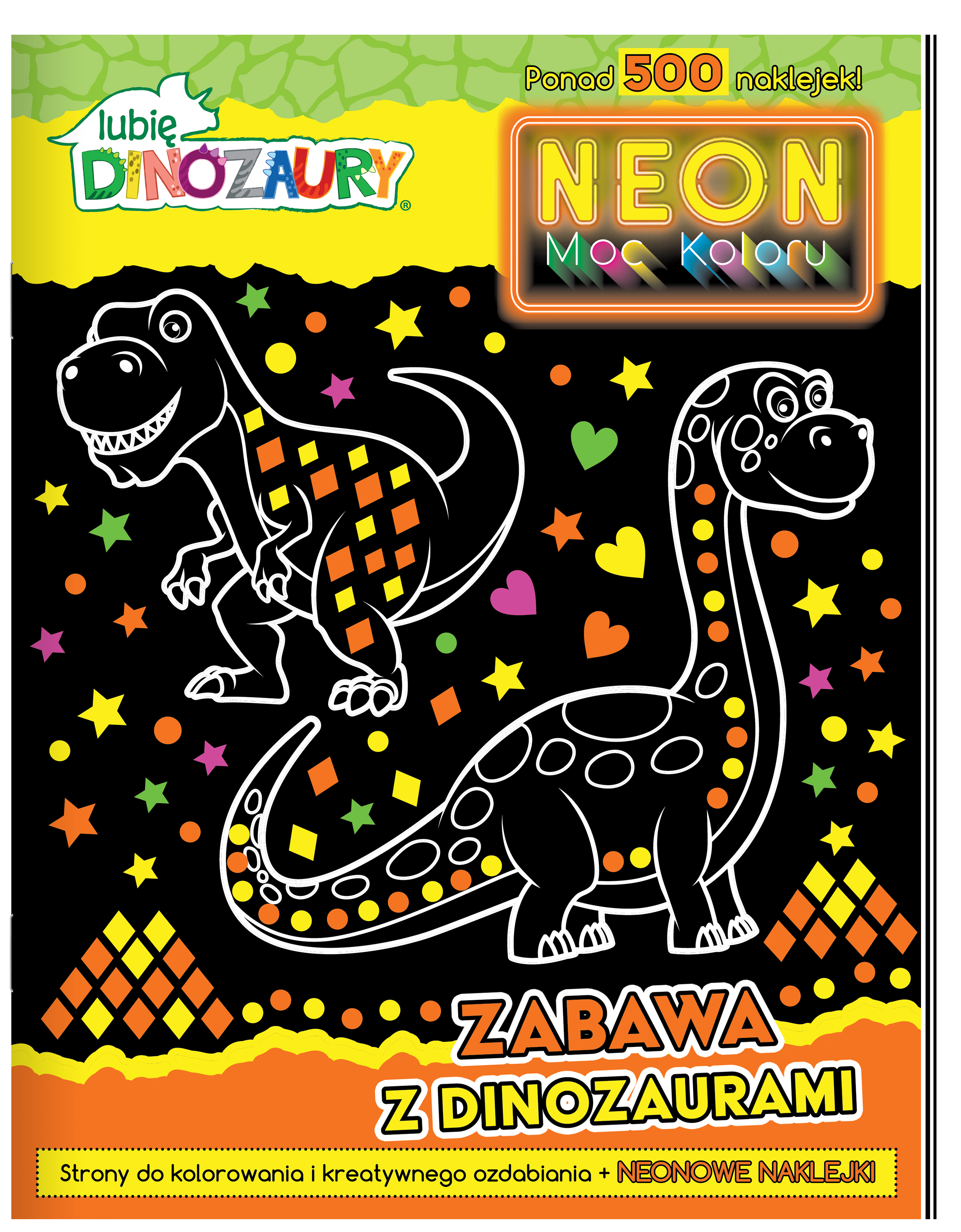 Lubię dinozaury. Neon moc koloru. Książka z obrazkami i z ponad 500 neonowymi naklejkami do tworzenia wyjątkowych, kreatywnych prac w środku strony do kolorowania i kreatywnego ozdabiania. Każda strona to nowa przygoda z dinozaurami! Twórz wyjątkowe i kreatywne prace! Koloruj bohaterów i wyklejaj strony neonowymi naklejkami. Efekt końcowy cię zaskoczy!