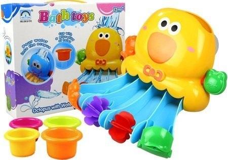 OŚMIORNICZKA Z KUBECZKAMI DO KĄPIELI Zestaw przeznaczony jest dla maluszków uwielbiających pluskać się w wodzie. Wesoła ośmiorniczka sprawi, że kąpiel stanie się niesamowitą przygodą. Spływająca woda z ośmiornicy utworzy mały wodospad, co sprawi wielką frajdę maluchowi. Zabawka wspiera kreatywność i rozwój motoryczny dziecka. Ośmiorniczka ma zamontowane przyssawki, dzięki którym można przymocować ją do płytek. W skład zestawu wchodzi: ośmiornica i 4 kubeczki. Wymiary ośmiornicy: 30 cm x 22 cm x 7 cm Wymiary opakowania: 32 cm x 8 cm x 28 cm Zabawka przeznaczona dla dzieci powyżej 12 miesiąca. Zestaw zapakowany w kolorowe pudełko, idealnie nadające się na prezent.