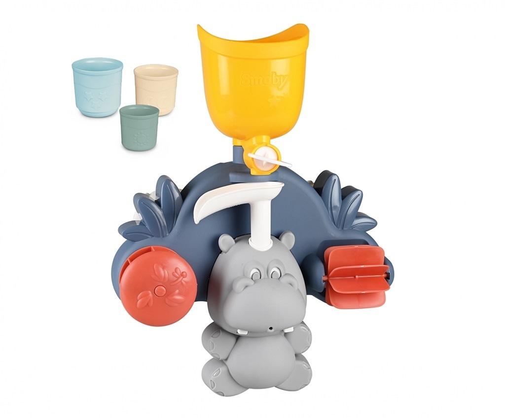Hipcio uwielbia wodę! Dziecko za pomocą trzech kubeczków o różnej wielkości może wlewać wodę do żółtego pojemnika i skierować ją w jednym z trzech kierunków. Brzdąc obserwuje, jak woda porusza kołami obrotowymi. Doświadczanie, samodzielnie przesuwanie elementów zabawki, wlewanie wody wszystkie te aktywności angażują dziecko motorycznie, przyczyniając się do jego rozwoju.