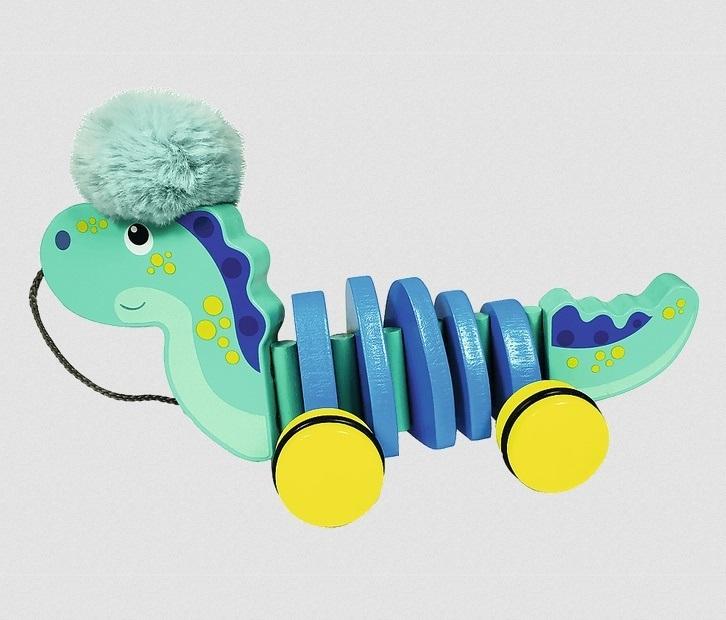 Dino Florentino z pluszowym pomponem wykonany został z naturalnego drewna. Jest doskonałą zabawką, która towarzyszy najmłodszym przy stawianiu pierwszych kroków. Zabawka jest idealnym rozwiązaniem dla dzieci od 12 miesiąca życia. Dinozaur wyposażony jest w sznureczek i małe drewniane kółeczka, dzięki którym zawsze podąża za swoim opiekunem. Wszystkie materiały wykorzystane do stworzenia zabawki posiadają atesty, a także zostały pomalowane nietoksycznymi farbami.