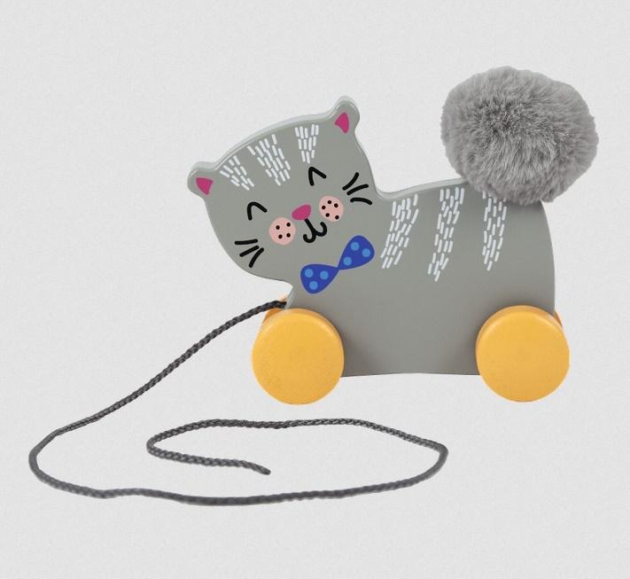 Kotek Psotek jest zabawką wykonaną z naturalnego drewna. Wspomaga najmłodszych przy stawianiu pierwszych kroków. Znakomite rozwiązanie dla dzieci od 12 miesiąca życia. Zabawka zachęca do wspólych spacerów, rozwijając dodatkowo odruch chwytania, dzięki ergonomicznemu kształtowi zaprojektowanemu specjalnie dla małych rączek. Kotek Psotek wyposażony jest w sznureczek i małe drewniane kółeczka, dzięki którym zawsze podąża za swoim opiekunem. Zabawka posiada miły i puszysty ogonek, który wspiera rozwój sensoryczny dziecka poprzez dotyk. Wszystkie materiały wykorzystane do stworzenia zabawki posiadają atesty, a także zostały pomalowane nietoksycznymi farbami.