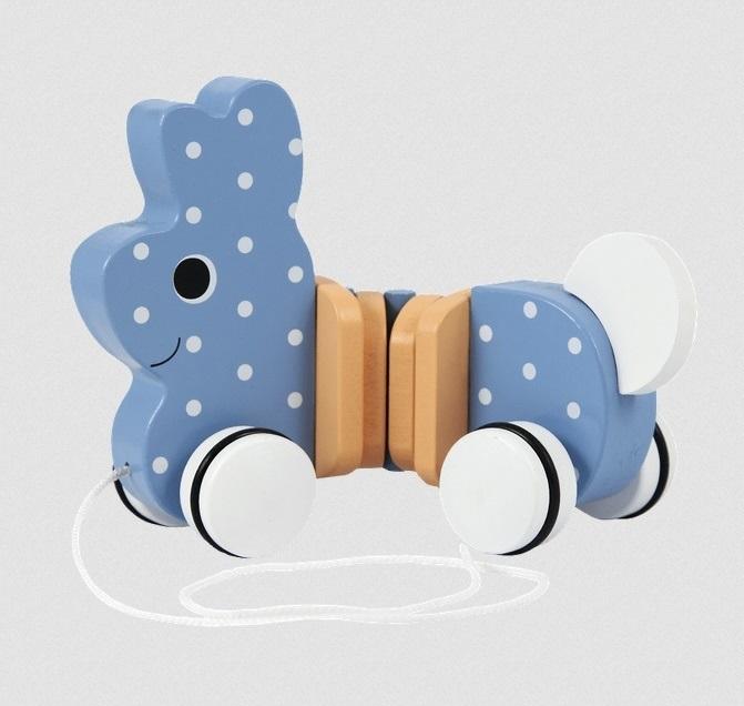 Króliczek Wędrowniczek to zabawka wykonana z naturalnego drewna. Jest doskonałym towarzyszem dzieci stawiających pierwsze kroki. Znakomite rozwiązanie dla dzieci od 12 miesiąca życia. Króliczek Wędrowniczek wyposażony jest w sznureczek i małe drewniane kółeczka, dzięki którym zawsze podąża za swoim opiekunem. Wszystkie materiały wykorzystane do stworzenia zabawki posiadają atesty, a także zostały pomalowane nietoksycznymi farbami.