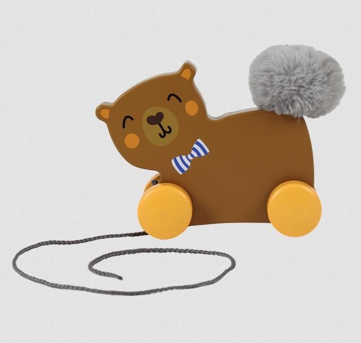 Misio Pysio to zabawka wykonana z naturalnego drewna. Jest doskonałą zabawką, która towarzyszy najmłodszym przy stawianiu pierwszych kroków. Znakomite rozwiązanie dla dzieci od 12 miesiąca życia. Misio Pysio wyposażony jest w sznureczek i małe drewniane kółeczka, dzięki którym zawsze podąża za swoim opiekunem. Zabawka posiada miły i puszysty ogonek, który wspiera rozwój sensoryczny dziecka poprzez dotyk. Wszystkie materiały wykorzystane do stworzenia zabawki posiadają atesty, a także zostały pomalowane nietoksycznymi farbami.