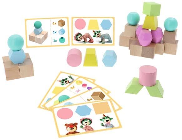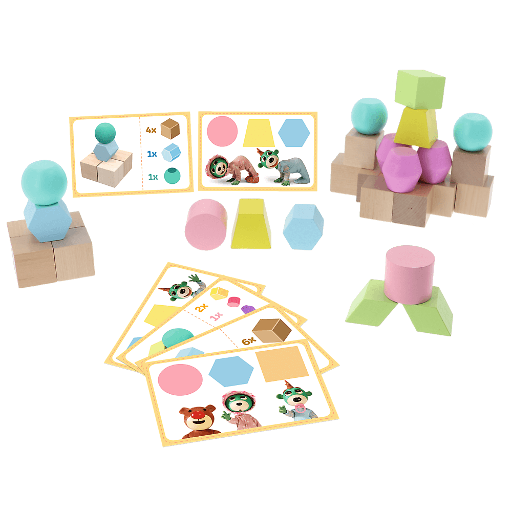 Dopasuj odpowiedni kształt klocka do obrazka znajdującego się na dużej karcie lub odwzoruj konstrukcję z karty w przestrzeni!