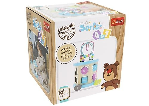 Wielofunkcyjna zabawka ogólnorozwojowa do nauki kształtów, kolorów oraz cyfr. Sorter angażuje dziecko do nauki poprzez zabawę- idealne rozwiązanie dla dzieci od 18 miesiąca życia. Dopasowywanie kształtów do otworów, przesuwanie koralików po torze oraz nawlekanie klocków na sznureczek wspomagają rozwój zdolności manipulacyjnych małych rączek. Klocki nadrukowane są dwustronnie z jednej strony liczba, z drugiej odpowiadający jej zapis słowny. Zabawka wzmacnia koordynację wzrokowo-ruchową dziecka, jednocześnie rozwijając umiejętność logicznego myślenia i koncentracji. Po skończonej nauce czas na zabawę. Odwróć sorter i zagraj z rodziną lub przyjaciółmi w prostą grę planszową. Wszystkie materiały wykorzystane do stworzenia zabawki posiadają atesty, a także zostały pomalowane nietoksycznymi farbami.