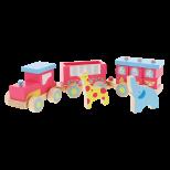 Wyjątkowy pociąg wykonany z jasnego, naturalnego drewna jest doskonałą zabawką ogólnorozwojową. Dzięki ruchomym kółkom zachęca do wspólnych spacerów, rozwijając dodatkowo odruch chwytania. Para zwierzaków do wkładania na wagoniki rozwija kreatywność, wspomaga naukę nazywania zwierząt i kolorów oraz ułatwia poznawanie kształtów. Wszystkie materiały wykorzystane do stworzenia zabawki posiadają atesty, a także zostały pomalowane nietoksycznymi farbami.