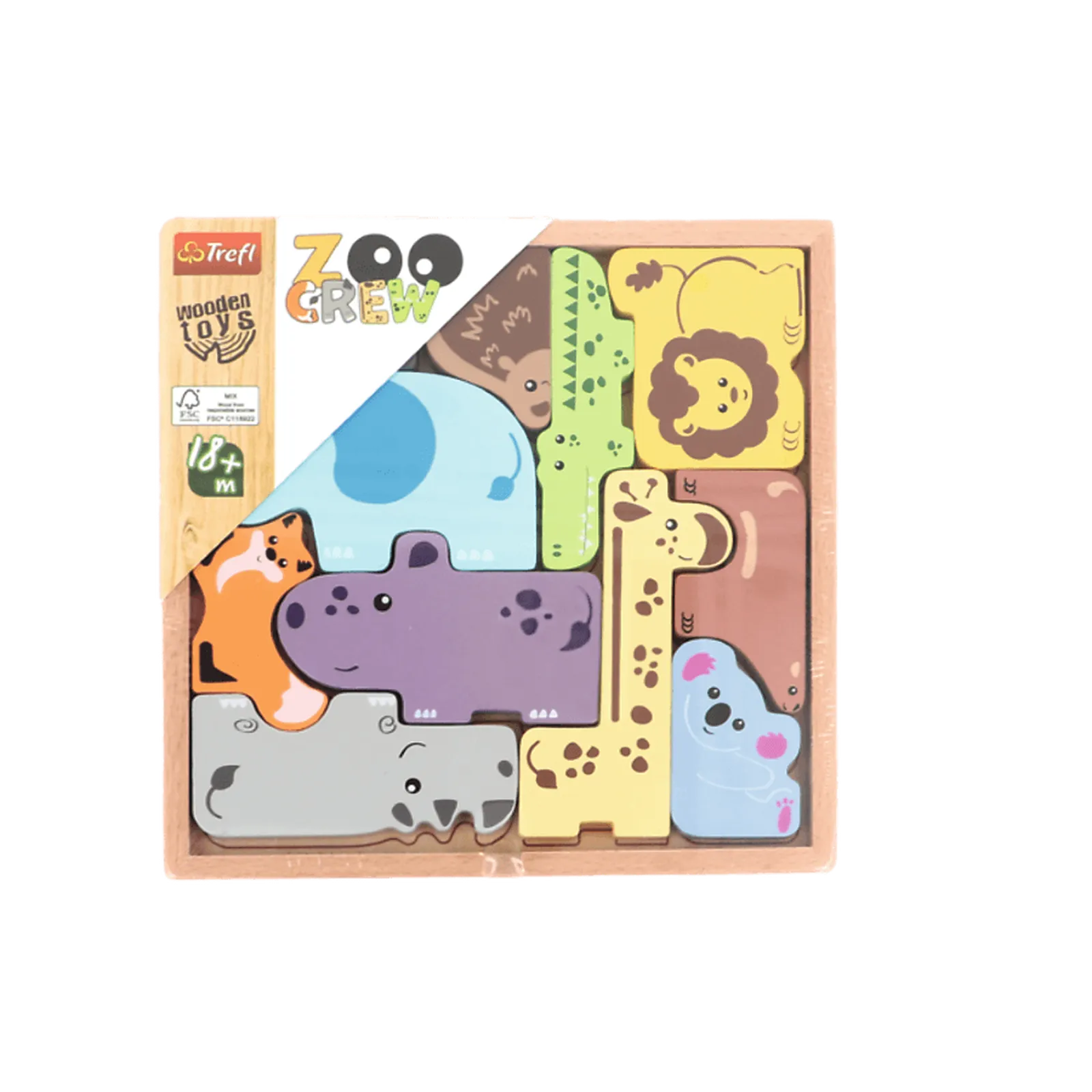ZOO crew to drewniana łamigłówka, która polega na ułożeniu wszystkich kolorowych zwierząt, tak aby wypełniły całą ramkę. Kontury znajdujące się na podstawce ułatwiają zadanie. Drewniane zwierzęta mogą również posłużyć za figurki do zabawy.