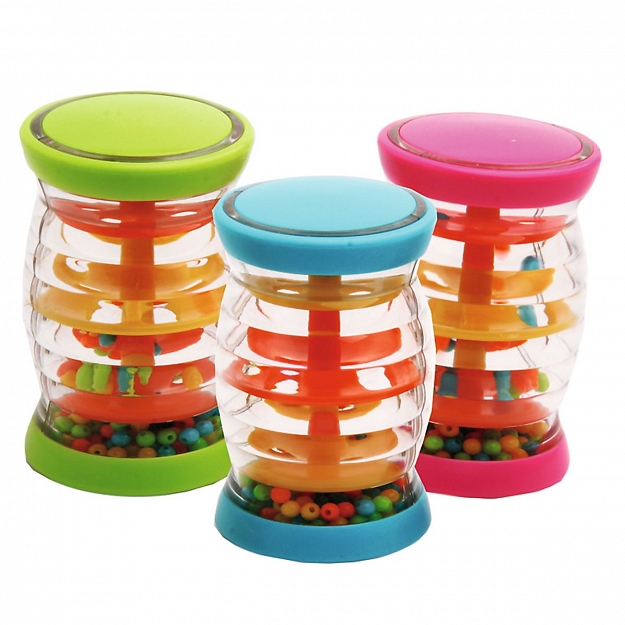 Grzechotka działa na zasadzie klepsydry – kiedy maluszek ją odwraca kuleczki przelatują wesoło grzechocząc, a smyk z zaciekawieniem obserwuje zachowanie plastikowych groszków. Zabawka jest bardzo poręczna - ma około 8,5 cm wysokości, idealna do zabawy dla maluszków już od 3-go miesiąca życia.