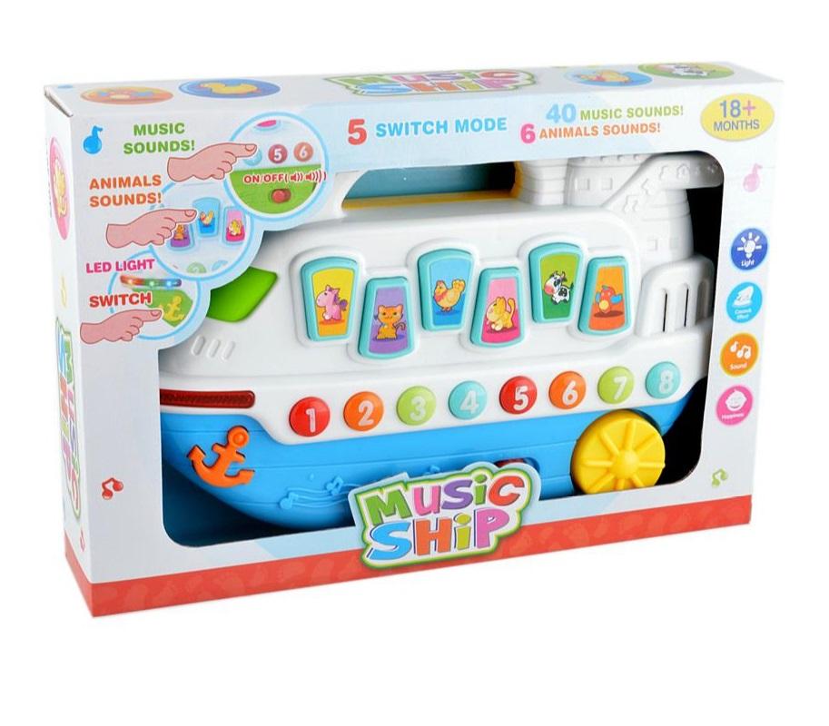 Interaktywny statek. Po naciśnieciu odpowiednich przycisków możemy usłyszeć dźwięki zwierząt, melodie, zmieniać kolory świateł.