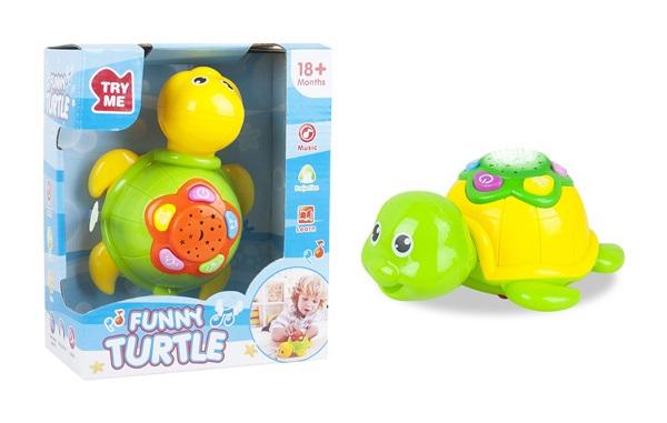 Zabawka muzyczna w kształcie żółwia, Uruchamiając przyciski włączają się różne funkcje dźwiękowe.