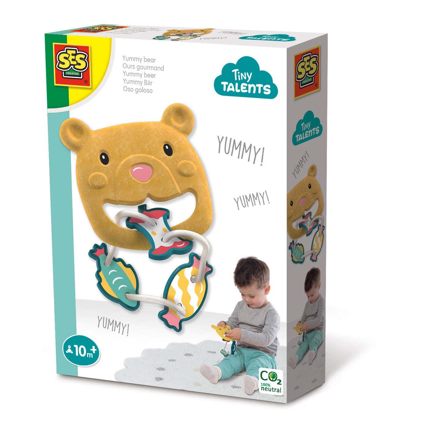 Pyszny! Ten miś jest zawsze głodny! Czy potrafisz włożyć mu figurki do buzi? Ponieważ figurki są połączone, nigdy się nie zgubią! W ten sposób możesz łatwo zabrać misia Yummy w dowolne miejsce. Różne kształty, materiały i kolory stymulują rozwój dotykowy dziecka, jego zdolności motoryczne i koordynację wzrokowo-ruchową. Dla dzieci w wieku od 6 miesięcy