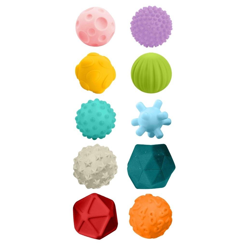 Zestaw zabawek sensorycznych 10szt. wykonany jest z tworzywa sztucznego i dlatego nadaje się i do kąpieli. Zawiera 10 różnokolorowych kształtów o różnej powierzchni, które po ściśnięciu piszczą. Zabawki rozwijają zmysły, wyobraźnię dziecka, koordynację ruchów oraz uczą poznawania kolorów i kształtów. Materiał jest bezpieczny, higieniczny i nie zawiera BPA. Odpowiedni dla dzieci od 6 miesięcy. Rozmiar zabawek: ok. 7 cm.