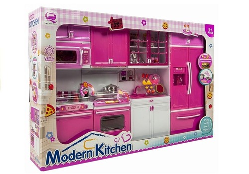 Zestaw składający się na pełne wyposażenie kuchni na pewno wzbudzi duże zainteresowanie każdego malucha. Korzystając z tej zabawki, dzieciaki mogą w przyjemny sposób naśladować swoich rodziców gotujących i przyrządzających desery w kuchni. Zabawkowa kuchnia stymuluje wyobraźnię dziecka, równocześnie rozwijając jego kreatywność i zdolności manualne. Zestaw składa się z imponującej liczby akcesoriów oraz elementów, które świecą i wydają dźwięki. Wybierając ten interaktywny zestaw możesz mieć pewność, że będzie strzałem w dziesiątkę. Kolejnym bardzo istotnym aspektem przedstawianej zabawki jest funkcja pozwalająca na otwieranie szafek i przyrządów, takich jak piekarnik, lodówka, zmywarka czy mikrofalówka. Wnętrze tych elementów wypełnione jest odpowiednimi nadrukami zawartości - talerzami lub jedzeniem. Dzięki zaskakującej ilości dodatkowego wyposażenia minikuchni dziecko może rozkładać garnki i produkty spożywcze według własnego pomysłu na zabawę. Na pewno dużo radości sprawią maluchom dźwięki, jakie wydaje piekarnik, czy wyskakujące grzanki z tostera. Warto wspomnieć o możliwość wykorzystania części pudełka jako jasnoróżowego tła dla kuchni, w której maluch może inscenizować przeróżne scenki z Tobą lub rówieśnikami. W skład zestawu zabawkowej kuchni wchodzą: - talerze, - taca, - patelnia, - garnki z pokrywkami, - szklanki, - młynki do przypraw, - małe zestawy pojemników do przypraw, - filiżanki, - chochla do zupy, - łopatka, - toster, - artykuły spożywcze: karton mleka, kostki lodu, cytryny, pomarańcze, marchewki, arbuza, polewę do ciasta, jedzenie w puszkach i kawałek tortu. Wymiary kuchni: - segmenty ze zmywarką i piekarnikiem: 11,5 cm x 34 cm x 8 cm, - segmenty ze zlewem i lodówką: 14,5 cm x 34 cm x 8 cm.