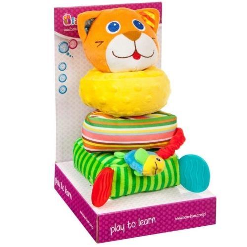Kolorowa, ZABAWNA PIRAMIDKA KOT wykonana z miękkiego materiału kółek jest zabawką edukacyjną dla dziecka od 6 m-ca życia. Uczy rozróżniania kolorów oraz wielkości przedmiotów o podobnych kształtach. Układanie kolorowych kół na stojaku jest także dla malucha doskonałym ćwiczeniem, rozwijającym jego sprawność manualną